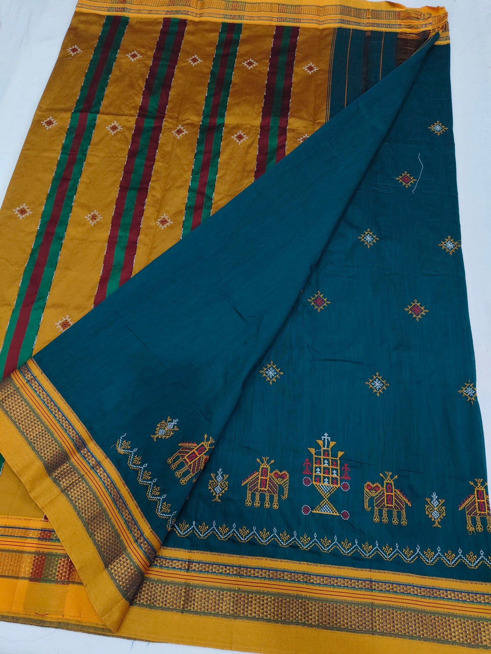 Like many other weavers, Ilkal too is essentially a household enterprise involving the active Gray Kasuti participation of female members. It tends to take about 7 days to weave one sari with the help of the handloom. The beautiful, distinct patterns on the pallus and the feminine borders make this a must-have in south Indian womenās closets Rama Colour Traditional Work Kasuti Saree