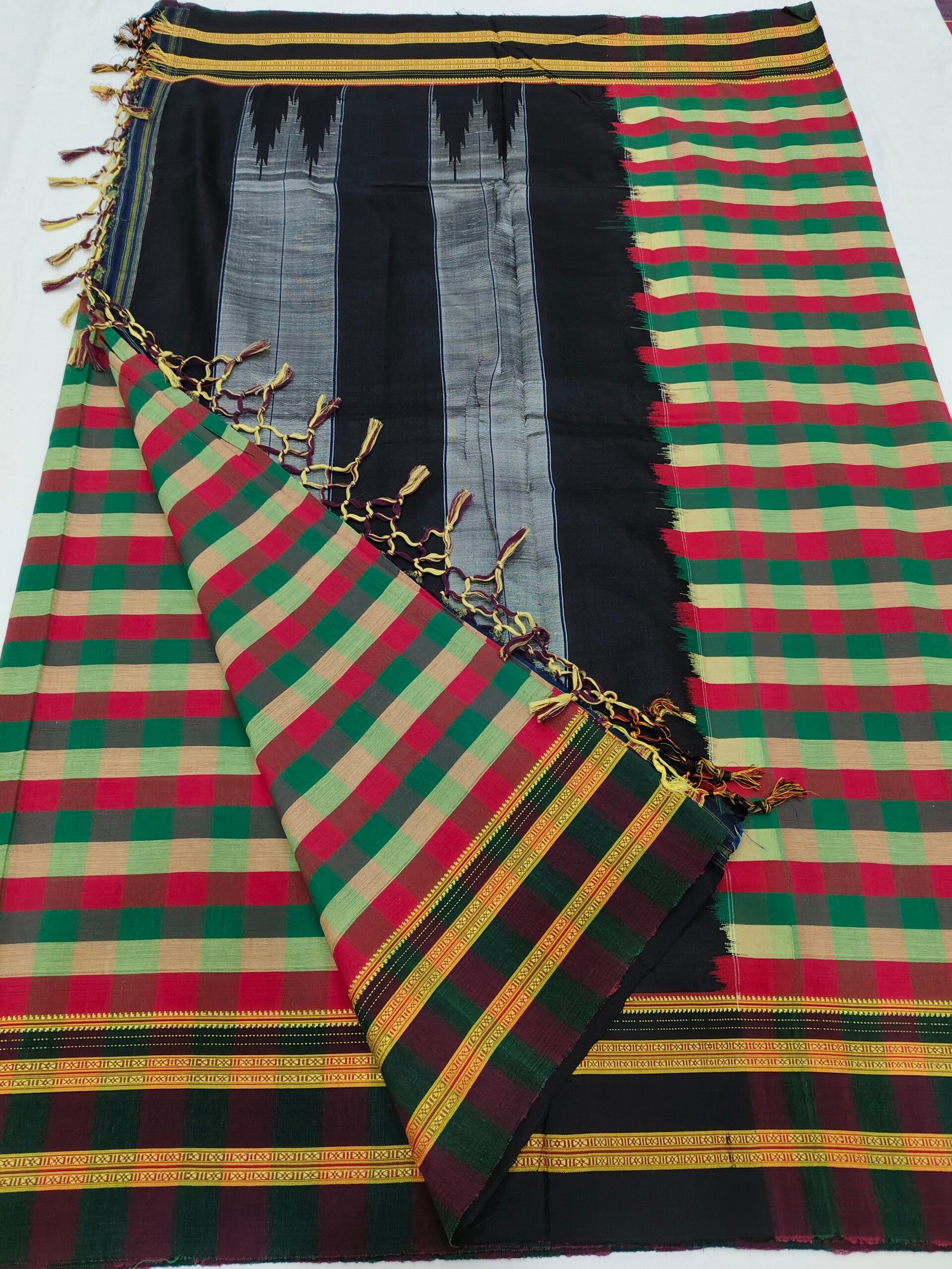 border, and pure silk on the pallu. This handloom comes from the glorious history of weaving culture: the town Ilkal was an ancient weaving center back in 8th century AD.